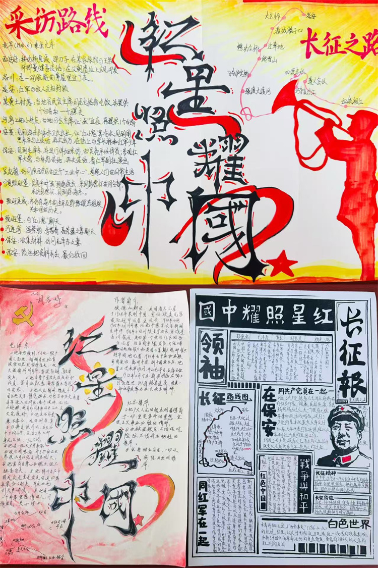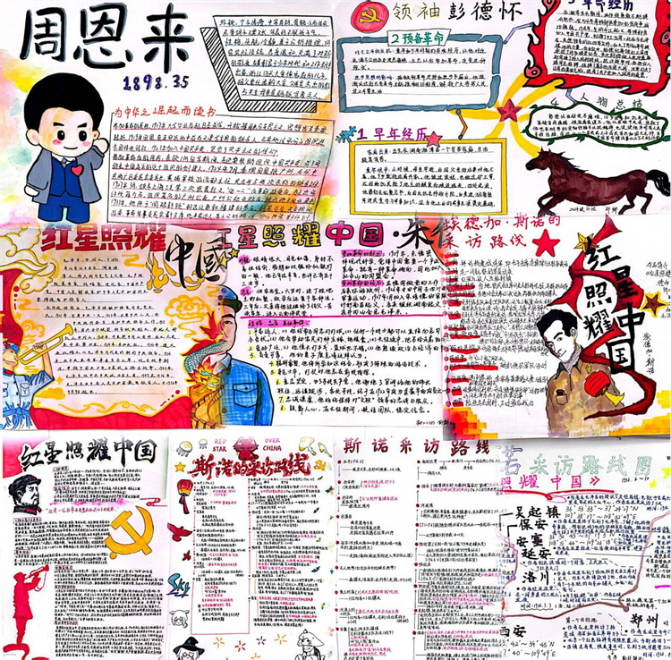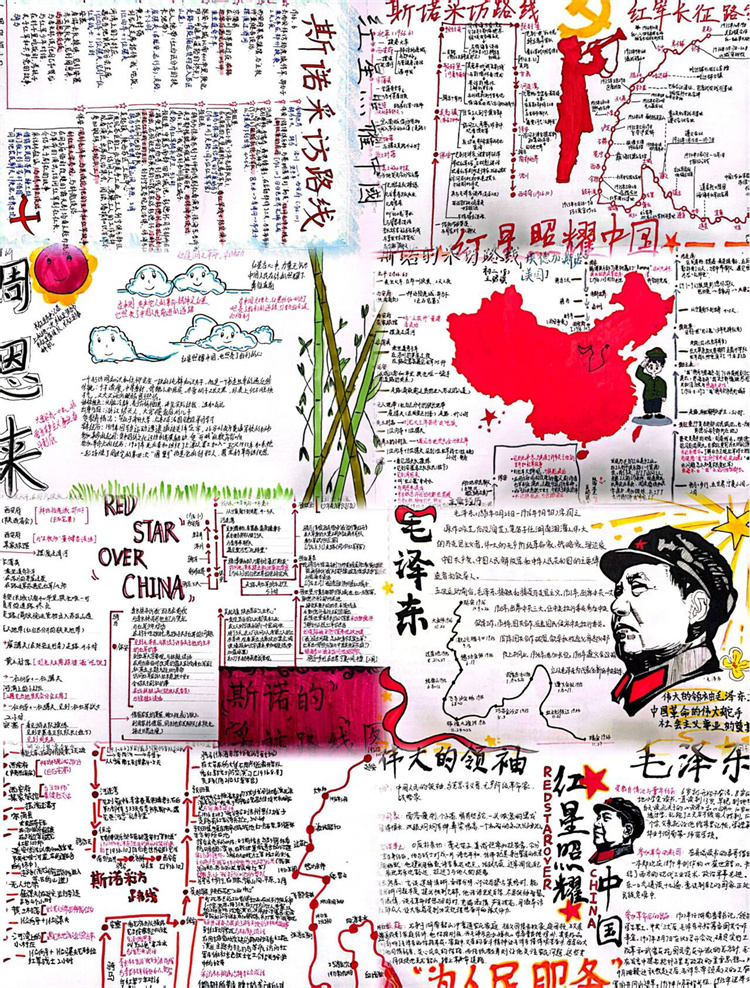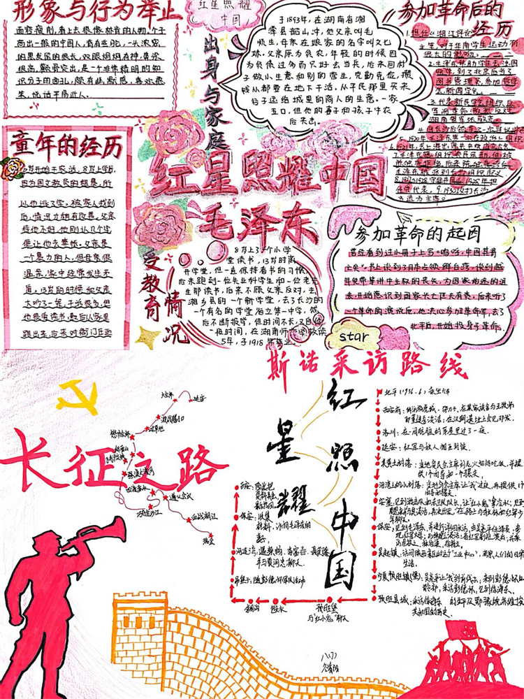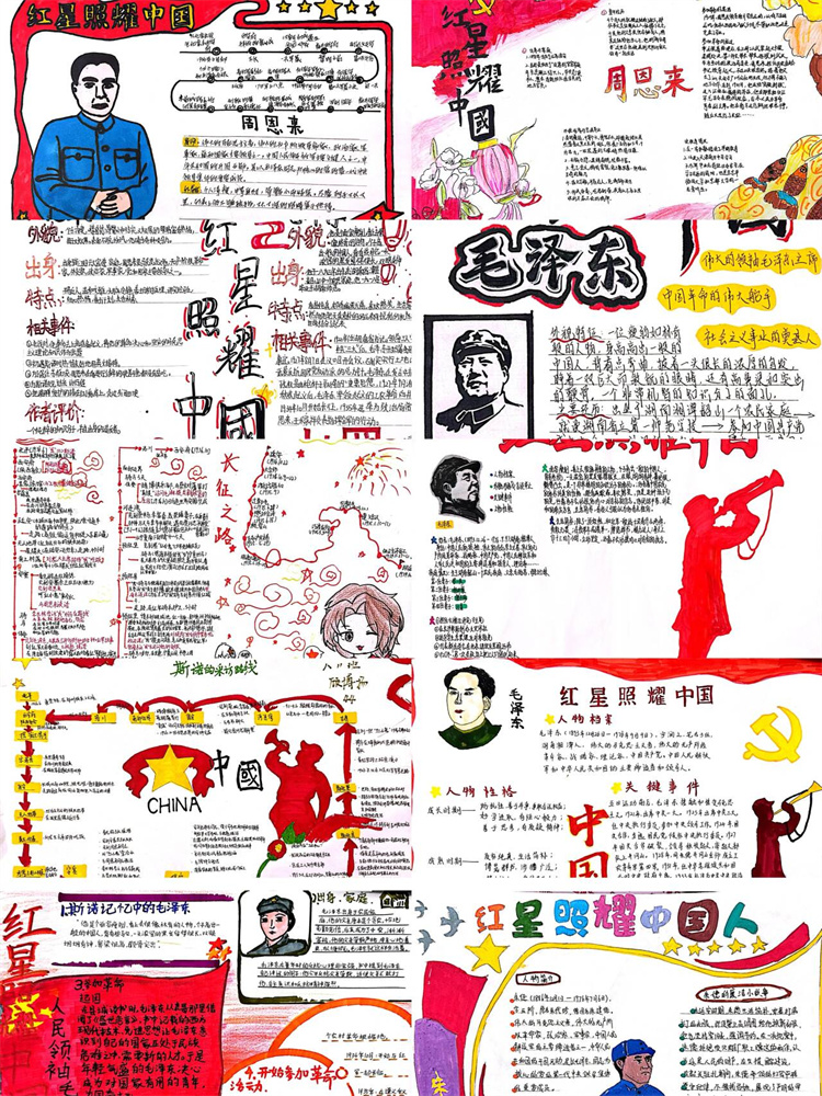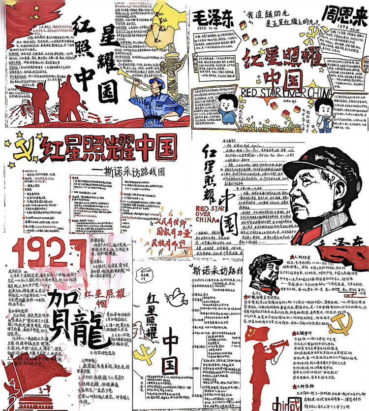 在《紅星照耀中國》專題探究中,同學們也展現出豐富的探究成果。手繪的“斯諾拜訪路線圖”細致還原了1936年斯諾前往陜北的曲折歷程,輔以采訪札記摘抄,生動再現歷史場景;“領袖人物檔案”則以圖文并茂的形式,立體呈現了毛澤東、周恩來、彭德懷等革命領袖的革命經歷與人格魅力。