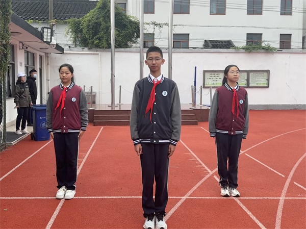 “回首來時路,風雨踏征途?!痹谶@個承載著厚重歷史的季節(jié),大地仿佛也在訴說著往昔的崢嶸歲月。早晨七點半,隨著《義勇軍進行曲》的雄壯旋律,升旗儀式正式開始。擔任今日升旗手的是李霏白同學,護旗手是陳沁橦和宗奚蕊同學。全體同學以崇敬的心情,整齊劃一的隊形和飽滿的精神狀態(tài),向緩緩升起的五星紅旗致以崇高的隊禮。