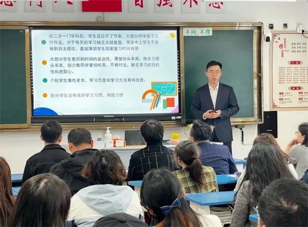 第二項(xiàng)流程,班主任和任課教師進(jìn)班交流。八年級(jí)孩子們正處在青春期的關(guān)鍵時(shí)期,有著諸多明顯的心理特點(diǎn)。由于學(xué)科數(shù)目增多、學(xué)習(xí)難度加大,孩子容易出現(xiàn)學(xué)習(xí)興趣下降、情緒波動(dòng)等問題,因此班主任們建議家長(zhǎng)與學(xué)校形成合力,密切關(guān)注學(xué)生的心理變化和精神狀態(tài),及時(shí)發(fā)現(xiàn)并反饋、解決問題。班主任們圍繞校園生活、學(xué)習(xí)、活動(dòng)、家校共育等主題細(xì)致入微地介紹了相關(guān)情況,分享教育的點(diǎn)點(diǎn)滴滴,以及如何面對(duì)新挑戰(zhàn)的有效方法。