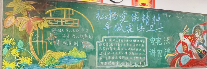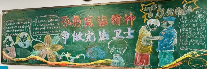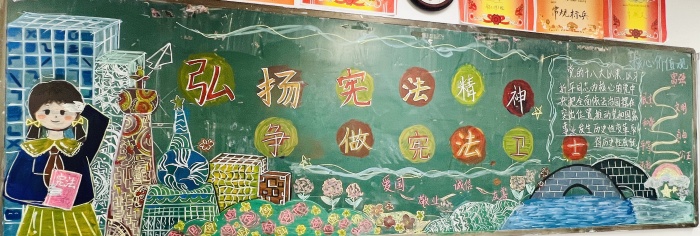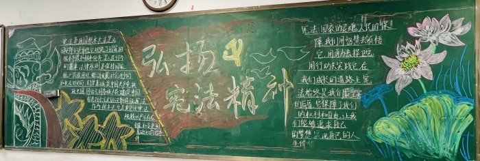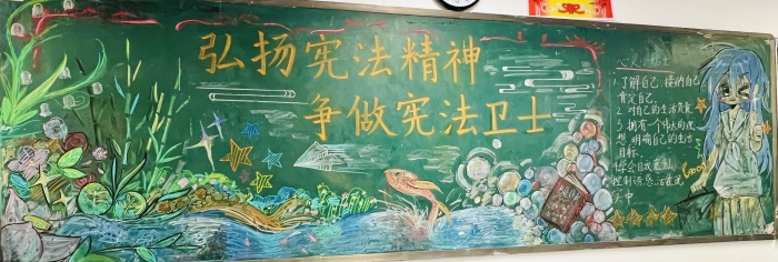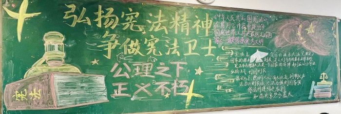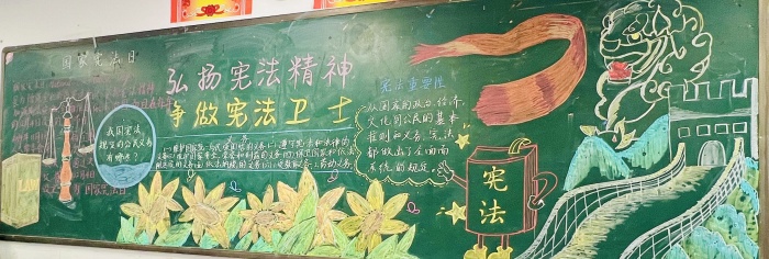 各班同學(xué)在班主任和美術(shù)老師的指導(dǎo)下,認(rèn)真查閱憲法相關(guān)資料,精心設(shè)計(jì)版面,用五彩斑斕的畫筆描繪出對憲法的理解與敬意。一幅幅黑板報(bào)主題鮮明、內(nèi)容豐富、形式多樣,既有憲法條文的解讀,又有生動形象的憲法故事案例;既有憲法在日常生活中重要作用的闡述,也有同學(xué)們爭做憲法小衛(wèi)士的決心表達(dá)。