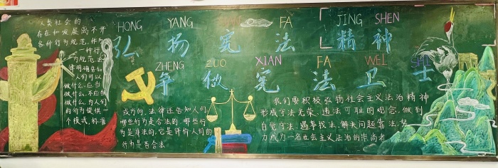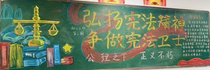 為深入學(xué)習(xí)宣傳憲法知識,弘揚(yáng)憲法精神,我校舉辦以 “弘揚(yáng)憲法精神,爭做憲法衛(wèi)士” 為主題的黑板報(bào)比賽,在校園內(nèi)掀起了一股學(xué)習(xí)憲法的熱潮。