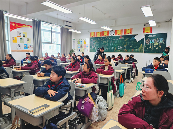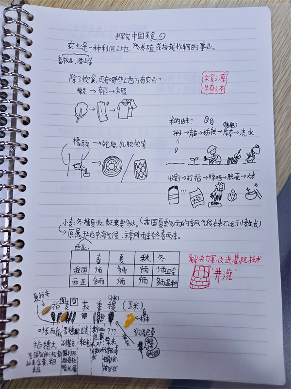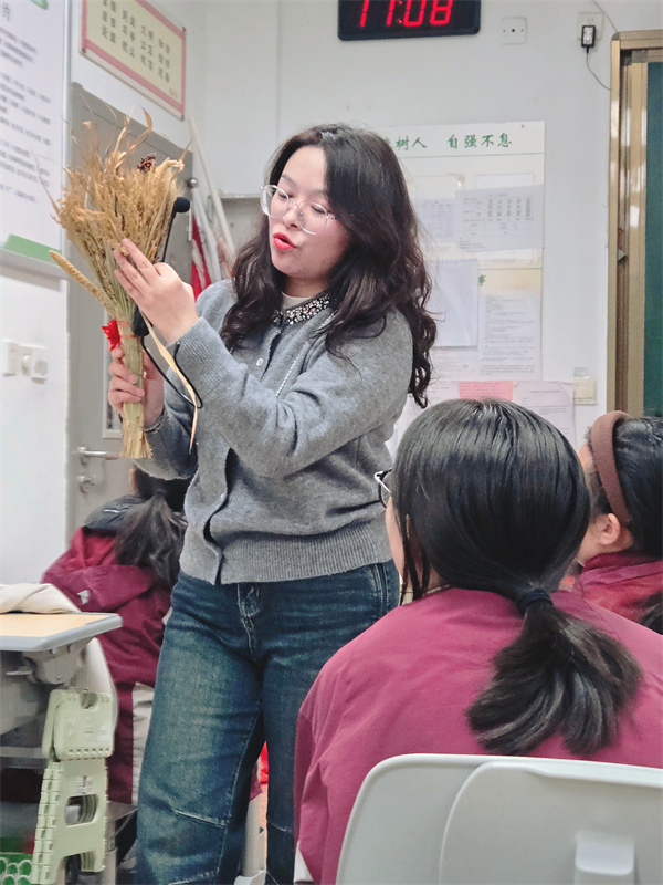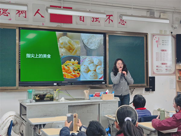 在飽餐一頓后,初一7班的學生們回到班級,地理組肖翠翠老師給同學們帶來了一場拓寬視野的講座《中華美食之旅》,共同感受舌尖上的中國。肖老師先是介紹了中國農(nóng)業(yè)的發(fā)展,重點著眼于基礎糧食的發(fā)展演變過程的介紹,同學們表示第一次對于每日吃的五谷雜糧有著如此清晰的追根朔源。緊接著,肖老師給同學們帶來了五谷雜糧的種子與成品標本,通過讓學生親手感知觸摸,近距離感受糧食的源來。最后,結合初中階段地理氣候知識,肖老師講解了五谷雜糧地理分布情況,“一方水土養(yǎng)一方人”,讓學生深刻感知到糧食的多方用途。值得一提的是,課程中還引入到“糧食作物未來發(fā)展”的話題,學生對此產(chǎn)生了深刻的討論,使得整場活動進入一定的理論高度。