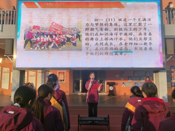 本周的升旗儀式由初一(11)班主要負責(zé),主持人是仇以然同學(xué),升旗手是鄭舜瑀同學(xué),護旗手是李昀兒同學(xué)和陳玥涵同學(xué)。當(dāng)主持人宣布升旗儀式正式開始時,初一(11)班國旗隊的三位同學(xué)邁著統(tǒng)一的步伐,在莊嚴的音樂中昂首向前,伴著國歌,五星紅旗在空中緩緩升起,在初升的太陽中迎風(fēng)飄揚。