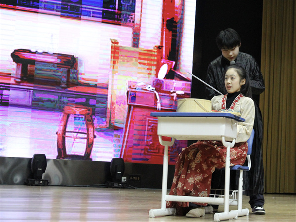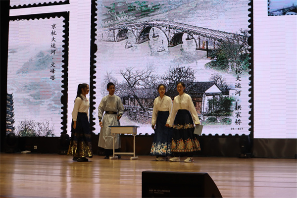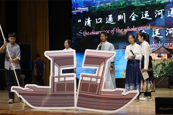 《大運(yùn)河——郵票上的歷史奇幻之旅》(The Grand Canal - A magical journey through history with stamps)則聚焦于中國(guó)的大運(yùn)河文化。通過(guò)舞臺(tái)上的時(shí)空轉(zhuǎn)換,學(xué)生們帶領(lǐng)觀眾沿著大運(yùn)河領(lǐng)略了不同歷史時(shí)期的風(fēng)貌。從運(yùn)河的開(kāi)鑿到它在經(jīng)濟(jì)、文化交流中的重要作用,都在英文舞臺(tái)劇的形式下得到了生動(dòng)的展現(xiàn)。