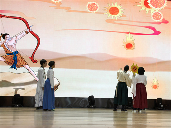 《嫦娥奔月》(Chang’e’s Flying to the Moon)別出心裁地將中國(guó)古老的神話傳說(shuō)搬上了英文舞臺(tái)。在保留中國(guó)傳統(tǒng)神話元素的基礎(chǔ)上,巧妙地運(yùn)用了現(xiàn)代舞臺(tái)技術(shù)。嫦娥飄逸的舞姿、后羿的英勇形象以及可愛(ài)的玉兔,在英文對(duì)白的詮釋下,展現(xiàn)出了別樣的魅力。這個(gè)節(jié)目不僅向觀眾傳播了中國(guó)傳統(tǒng)文化,還展示了學(xué)生們跨文化交流的能力。