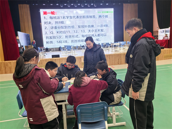 本次大賽分為初賽和決賽兩個階段。初賽階段,選手們需要先兩兩對決,解決一系列算24點的問題,這些問題設(shè)計巧妙,既考驗了選手的計算速度,也考驗了他們的策略選擇。經(jīng)過激烈的角逐,共有16名選手脫穎而出,進入決賽。決賽階段,難度進一步提升,題目不僅被投影在了大屏上,還要求他們快速計算。選手們沉著應(yīng)對,展現(xiàn)出了卓越的數(shù)學(xué)才能和團隊合作精神。經(jīng)過幾輪緊張刺激的比拼,最終,來自初一5、11、15、16班的四支參賽隊伍榮獲特等獎,他們不僅計算迅速準確,而且在策略運用上也顯得游刃有余。來自初一2、7、9、13班的四支參賽隊伍榮獲一等獎,來自初一1、3、4、6、8、10、12、14班的八支參賽隊伍榮獲二等獎。