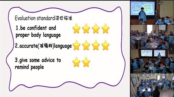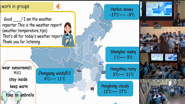 第二節(jié)課,許文靜老師以揚(yáng)州的四季圖片作為導(dǎo)入,通過(guò)學(xué)生熟悉的景點(diǎn)將學(xué)生代入課堂。在聽(tīng)力環(huán)節(jié),許老師進(jìn)行了充分地聽(tīng)前指導(dǎo)和準(zhǔn)備,學(xué)生在聽(tīng)前獲得了與此相關(guān)的背景知識(shí),同時(shí),采取多種形式對(duì)描述天氣和氣溫的句型反復(fù)操練。在輸出環(huán)節(jié),許老師通過(guò)一段簡(jiǎn)單的天氣預(yù)報(bào)視頻讓學(xué)生歸納天氣預(yù)報(bào)所包含的要素,并讓學(xué)生根據(jù)課本天氣預(yù)報(bào)的內(nèi)容來(lái)總結(jié)天氣預(yù)報(bào)時(shí)可使用的表達(dá)方式與技巧,提升學(xué)生用英語(yǔ)表達(dá)的自信心。在小組展示環(huán)節(jié),許老師精心設(shè)計(jì)了評(píng)價(jià)量表,指導(dǎo)學(xué)生通過(guò)“點(diǎn)亮星星”的生生互評(píng)活動(dòng),激發(fā)學(xué)生主動(dòng)參與“用英語(yǔ)預(yù)報(bào)天氣”等語(yǔ)言輸出活動(dòng)的熱情。此外,許老師還設(shè)計(jì)了“南北半球氣候不同”跨學(xué)科探究活動(dòng),鼓勵(lì)學(xué)生用英語(yǔ)闡釋此類現(xiàn)象。
