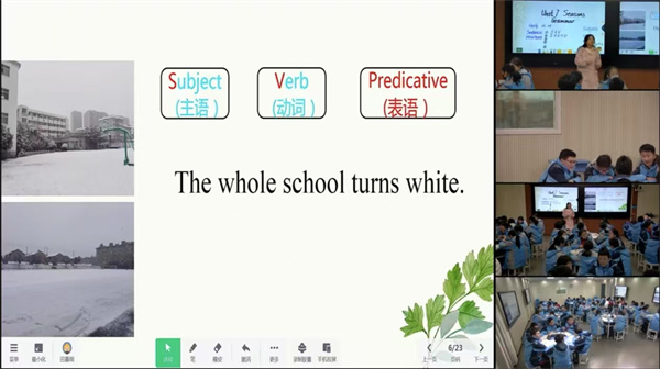 第一節(jié)課,田慕雨老師以學(xué)生學(xué)習(xí)生活的校園四季美景作為切入點(diǎn),巧妙引導(dǎo)學(xué)生用英語(yǔ)短句描述圖中美景。田老師隨即以學(xué)生描述的英語(yǔ)短句為范例,示范分析簡(jiǎn)單句的基本句型S+V。隨后,田老師緊密結(jié)合學(xué)生親身參與的校園運(yùn)動(dòng)會(huì)這一真實(shí)情境,引導(dǎo)學(xué)生們說(shuō)出含有簡(jiǎn)單句基本句型的英語(yǔ)短句。針對(duì)本節(jié)課的兩個(gè)難點(diǎn)——S+V+O和S+V+P的基本結(jié)構(gòu),S+V+IO+DO和S+V+DO+OC的基本結(jié)構(gòu),田老師進(jìn)行了清晰而細(xì)致的辨析講解。最后的寫(xiě)作任務(wù)環(huán)節(jié),田老師創(chuàng)設(shè)了“運(yùn)用所學(xué)的簡(jiǎn)單句的五種基本句型”創(chuàng)作一篇題為“My favorite season”的英語(yǔ)作文,描述該季節(jié)的景色與活動(dòng)。田老師的教學(xué)活動(dòng)設(shè)計(jì)環(huán)環(huán)相扣、緊密相連,有效增強(qiáng)了學(xué)生對(duì)“形式、意義與使用”三維動(dòng)態(tài)語(yǔ)法觀的理解,提升了學(xué)生運(yùn)用五種基本句型實(shí)施寫(xiě)作的能力。