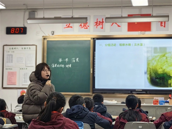 揚(yáng)州市中學(xué)生物教研員劉滿希博士走進(jìn)初一12班張潔老師的課堂。張老師執(zhí)教的《藻類(lèi)》一課以古詩(shī)引入,巧妙設(shè)置觀察水綿、海帶等活動(dòng)環(huán)節(jié),引導(dǎo)學(xué)生認(rèn)識(shí)生物特征與功能。張老師的課堂氣氛活躍,師生、生生互動(dòng)頻繁。這節(jié)課獲得了教研員和校內(nèi)老師的一致認(rèn)可。