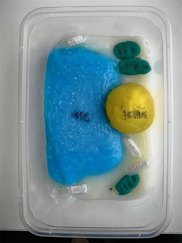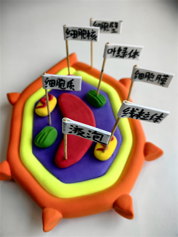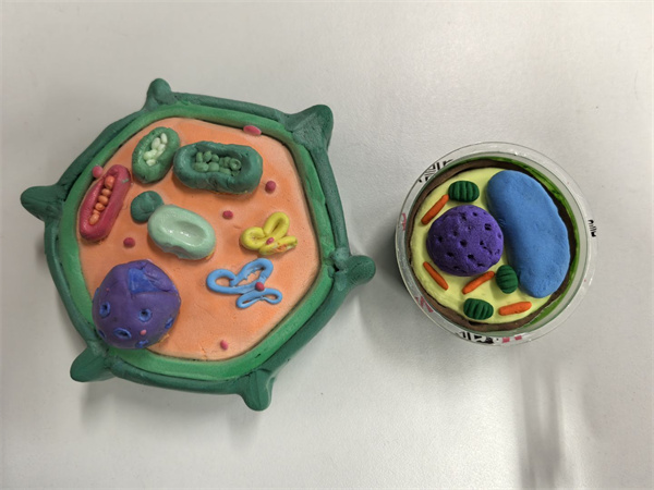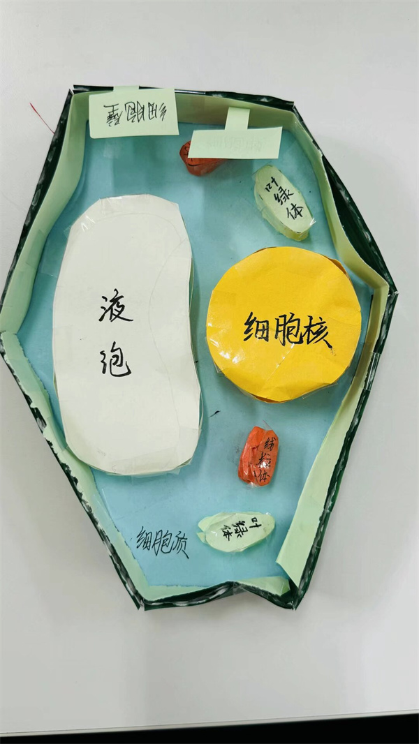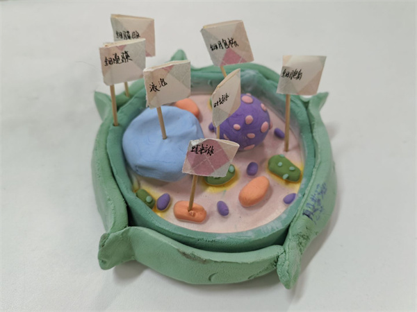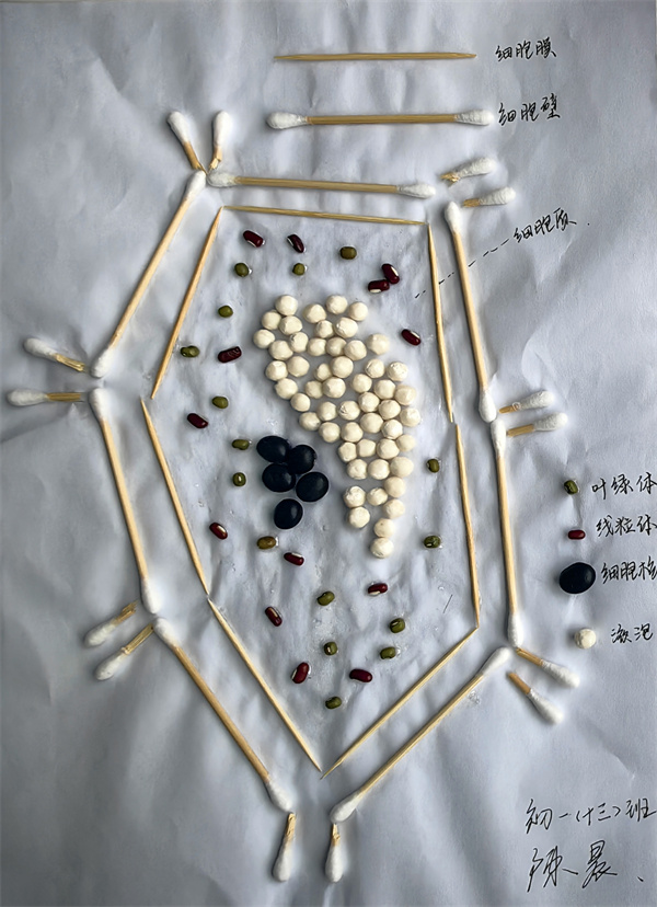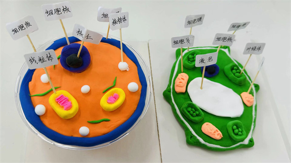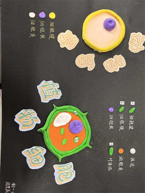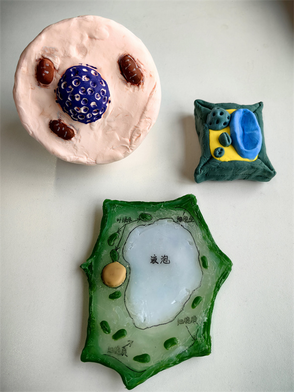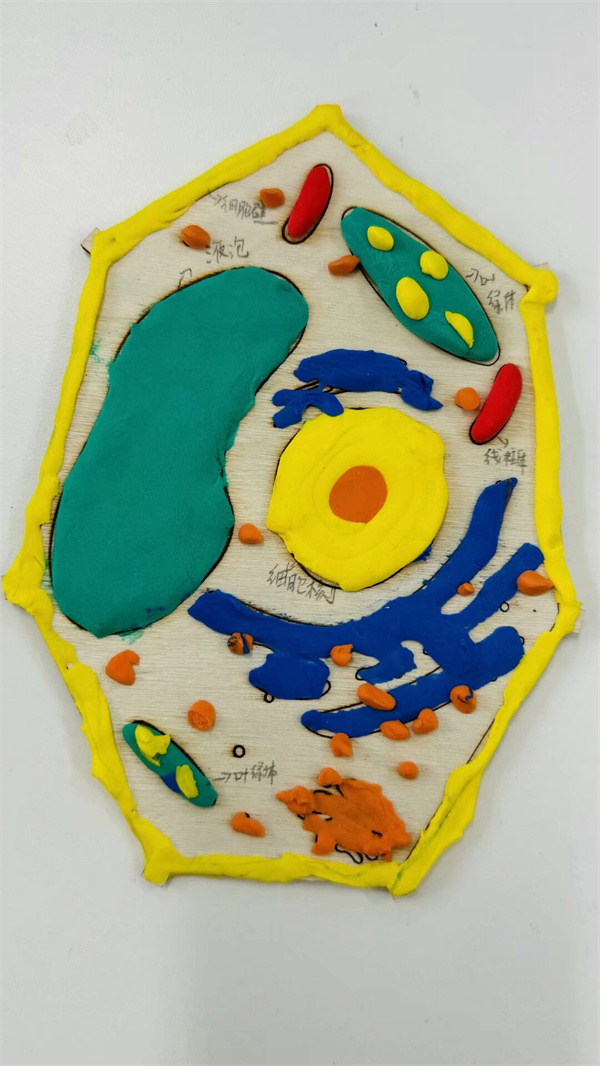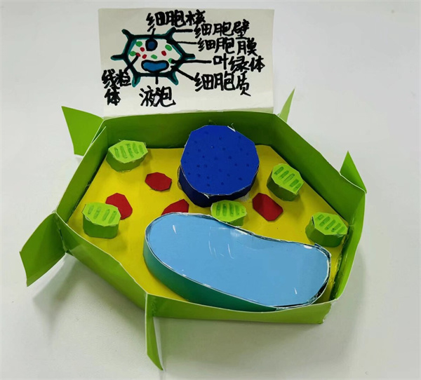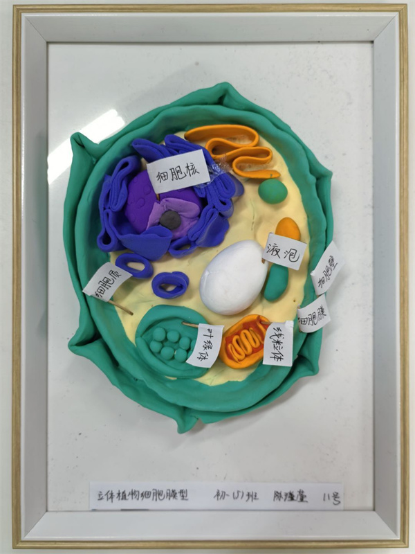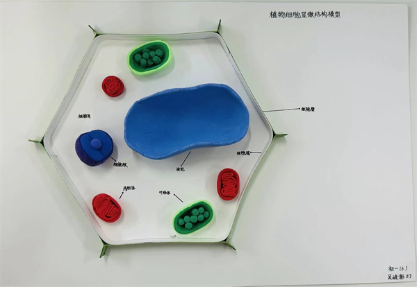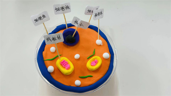 初一年級(jí)以"探尋生命奧秘"為主題,提供兩項(xiàng)跨學(xué)科作業(yè)選擇。學(xué)生既可利用廢舊材料制作動(dòng)植物細(xì)胞立體模型,通過(guò)捏塑、拼接理解細(xì)胞結(jié)構(gòu);也可打造微型水族箱,在飼養(yǎng)金魚(yú)的全程觀察中培養(yǎng)生態(tài)意識(shí)。在本次活動(dòng)中,七年級(jí)學(xué)生利用身邊簡(jiǎn)易材料,綜合運(yùn)用了生物學(xué)、數(shù)學(xué)、美術(shù)、物理等學(xué)科的概念與方法,高質(zhì)量的完成了細(xì)胞模型和水族箱的制作。