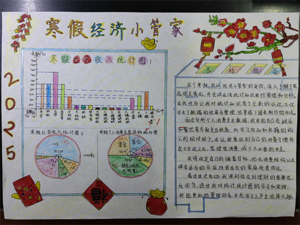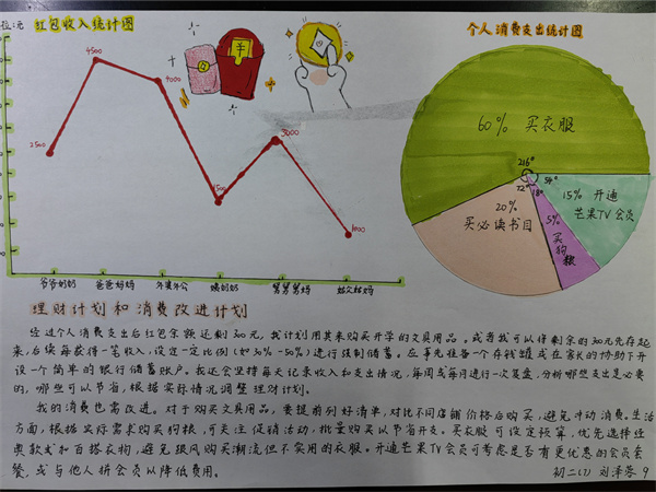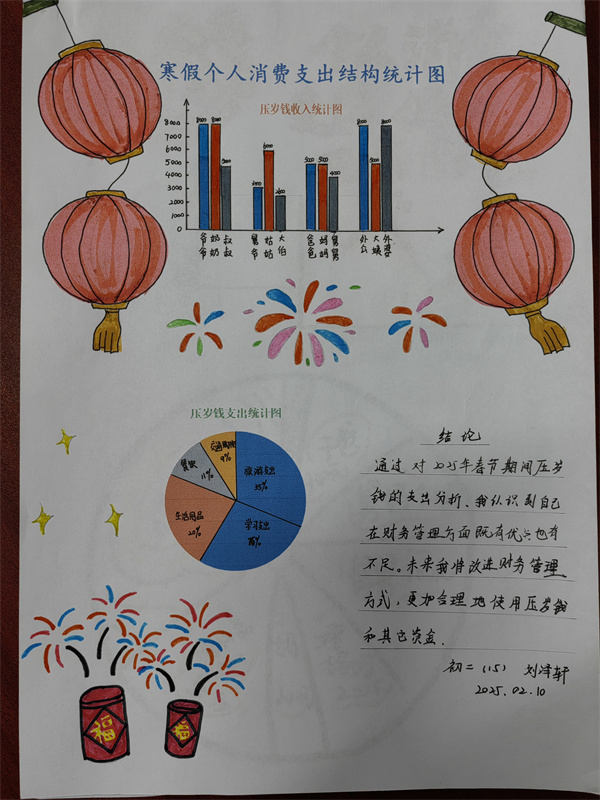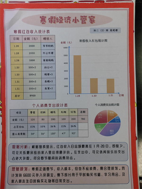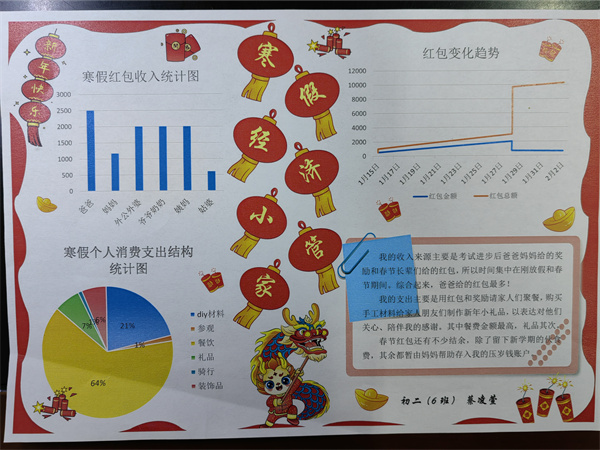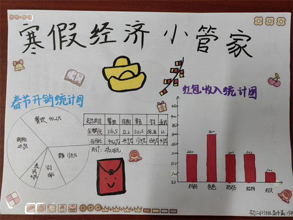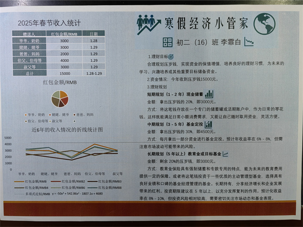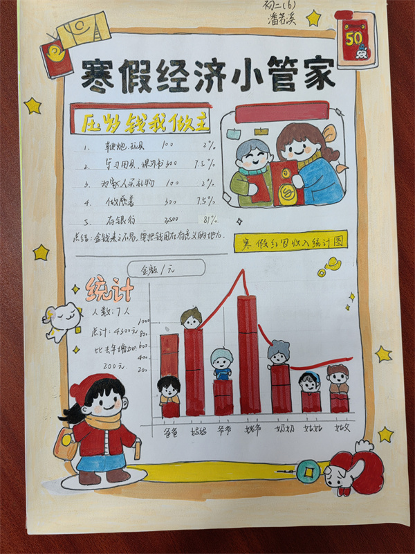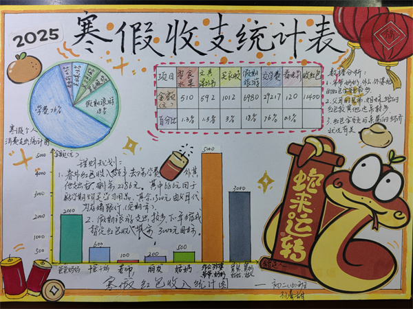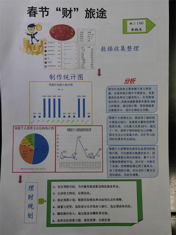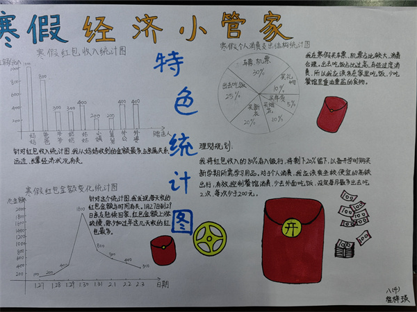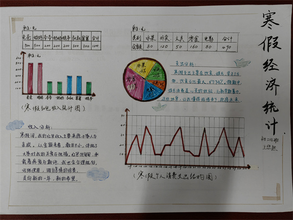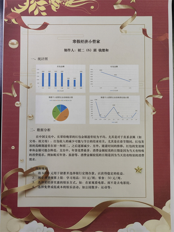 為培養(yǎng)學生的財商意識與數(shù)學應用能力,初二數(shù)學組在寒假之前推出“寒假經(jīng)濟小管家”實踐項目。學生們通過繪制統(tǒng)計圖表、撰寫財務報告等形式,將數(shù)學知識與生活場景深度融合,展現(xiàn)出獨特的實踐智慧。