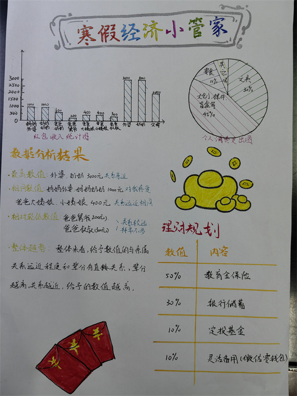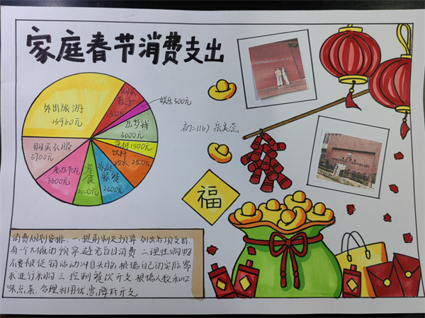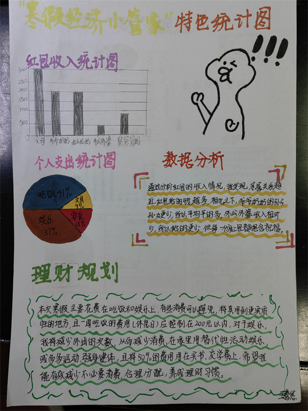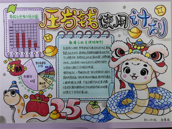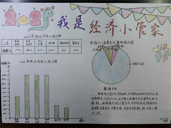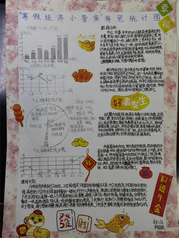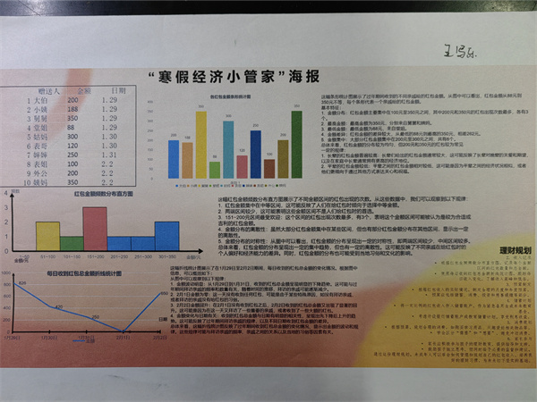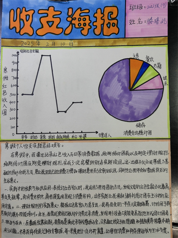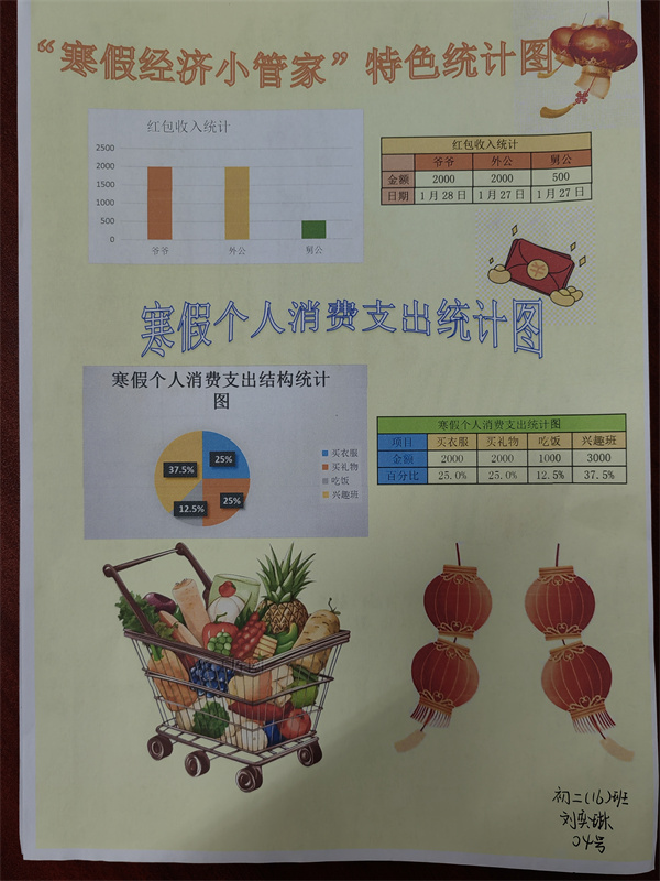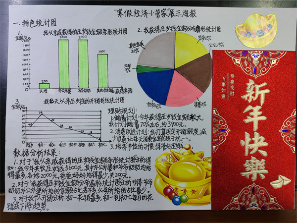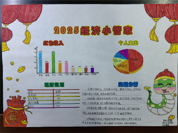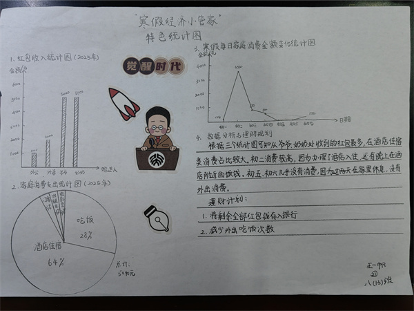 為培養(yǎng)學生的財商意識與數(shù)學應用能力,初二數(shù)學組在寒假之前推出“寒假經(jīng)濟小管家”實踐項目。學生們通過繪制統(tǒng)計圖表、撰寫財務報告等形式,將數(shù)學知識與生活場景深度融合,展現(xiàn)出獨特的實踐智慧。