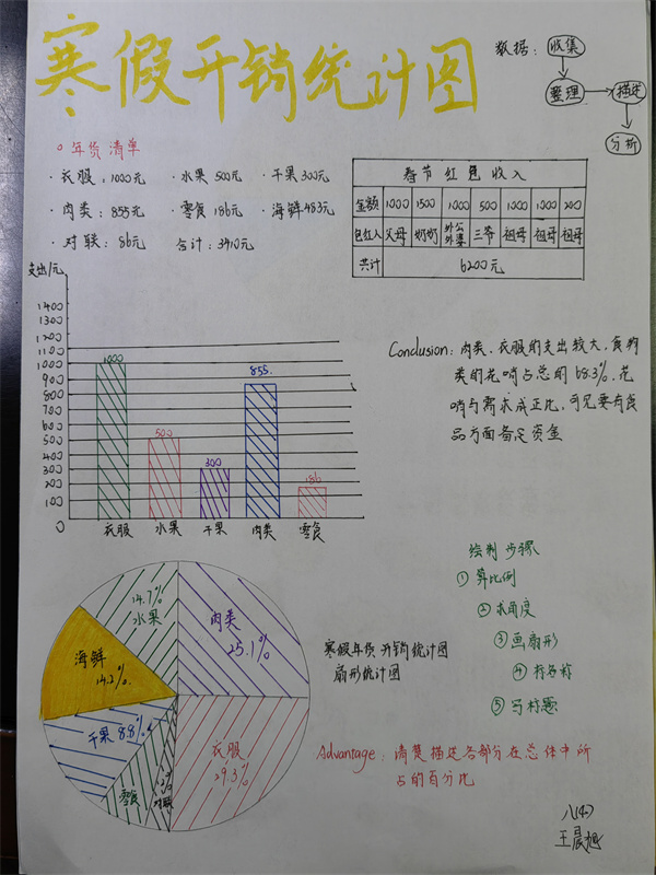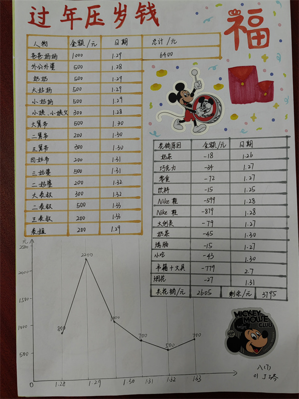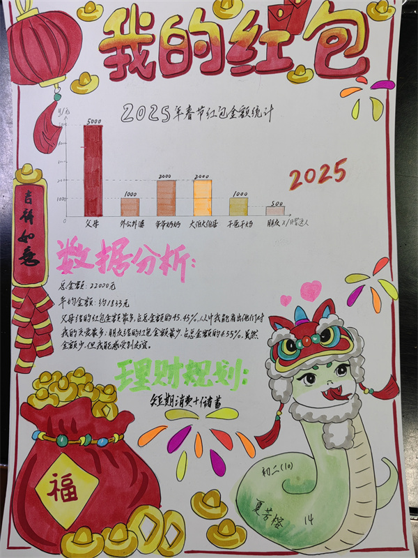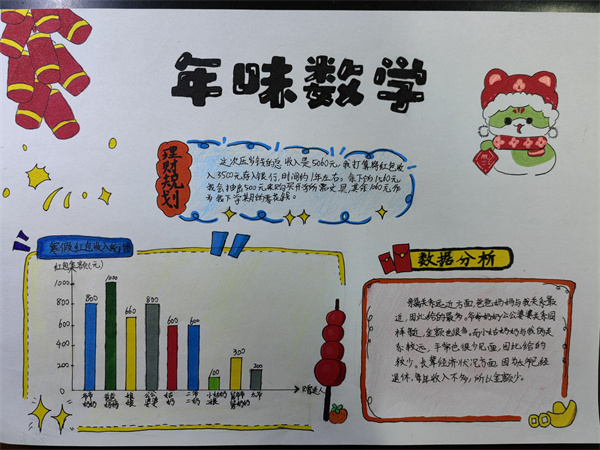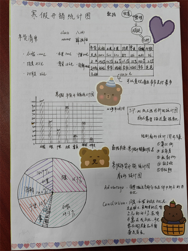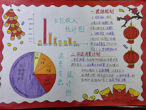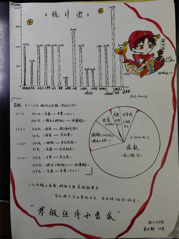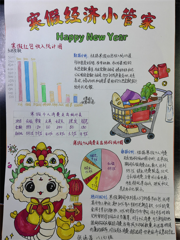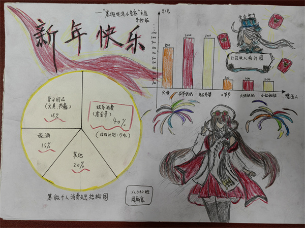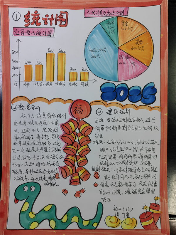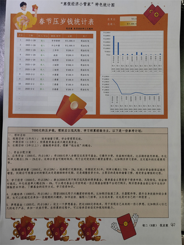為培養(yǎng)學生的財商意識與數(shù)學應用能力,初二數(shù)學組在寒假之前推出“寒假經(jīng)濟小管家”實踐項目。學生們通過繪制統(tǒng)計圖表、撰寫財務報告等形式,將數(shù)學知識與生活場景深度融合,展現(xiàn)出獨特的實踐智慧。