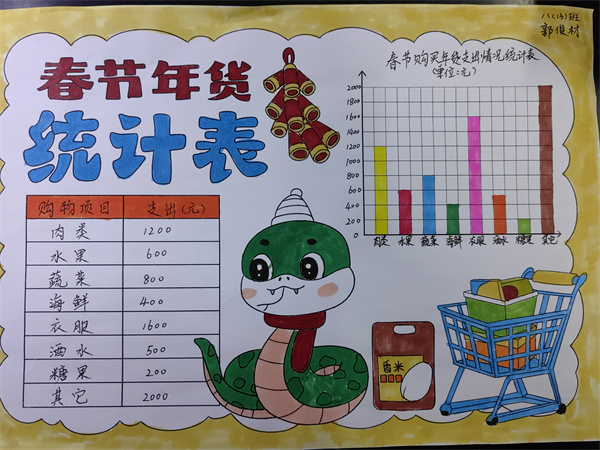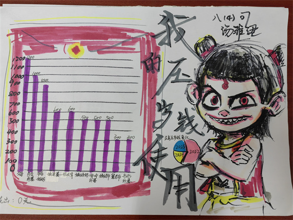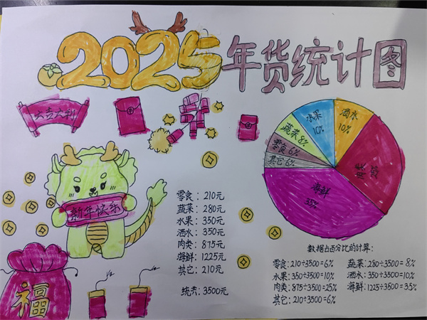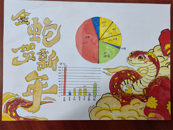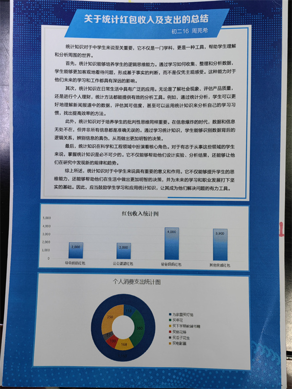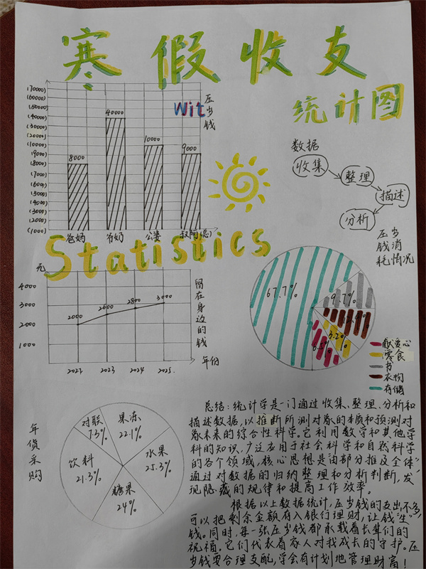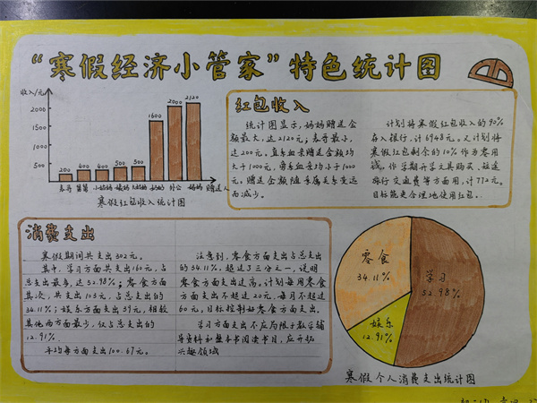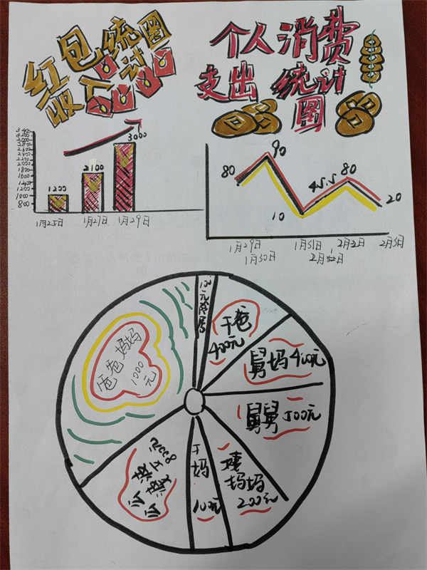 一幅幅色彩鮮明、邏輯清晰的統(tǒng)計圖表引人駐足。學生們以寒假期間個人或家庭的收支數(shù)據(jù)為素材,運用條形統(tǒng)計圖、折線統(tǒng)計圖、扇形統(tǒng)計圖等工具,生動呈現(xiàn)了“壓歲錢流向”“日用品開支占比”“娛樂消費趨勢”等主題。