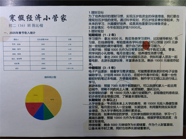 更有學生將壓歲錢按“儲蓄50%、理財20%、公益10%、消費20%”分配,制定了人生第一份財務計劃。