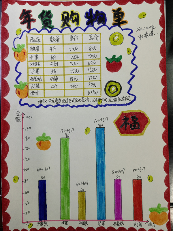 本次活動突破了傳統(tǒng)數(shù)學作業(yè)的邊界,將學科知識與德育、勞動教育深度融合。學生既在數(shù)據(jù)收集中體驗了“家庭采購員”“記賬員”的角色,又在分析報告中鍛煉了邏輯思維與表達能力。