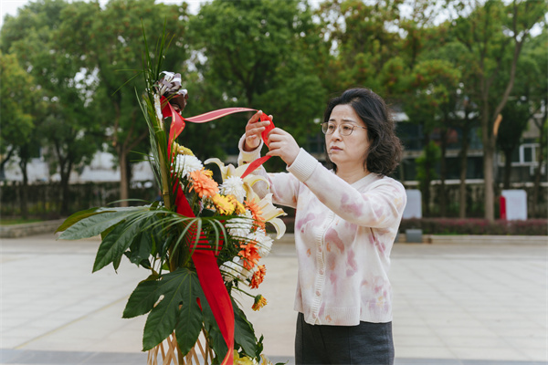 上午9時(shí)許,全體師生抵達(dá)蘇南抗戰(zhàn)勝利紀(jì)念廣場,在莊嚴(yán)肅穆的紀(jì)念廣場,活動在雄壯的國歌聲中正式開始。師生們整齊列隊(duì),向革命烈士默哀致敬。南門街校區(qū)校長姜亞芹女士代表學(xué)校敬獻(xiàn)花籃,仔細(xì)整理挽聯(lián)。初一(5)班徐璟同學(xué)作為學(xué)生代表發(fā)言,她以"傳承紅色基因,爭做時(shí)代新人"為題,表達(dá)了新時(shí)代青少年繼承先烈遺志、報(bào)效祖國的堅(jiān)定決心。