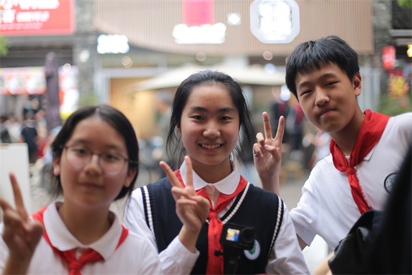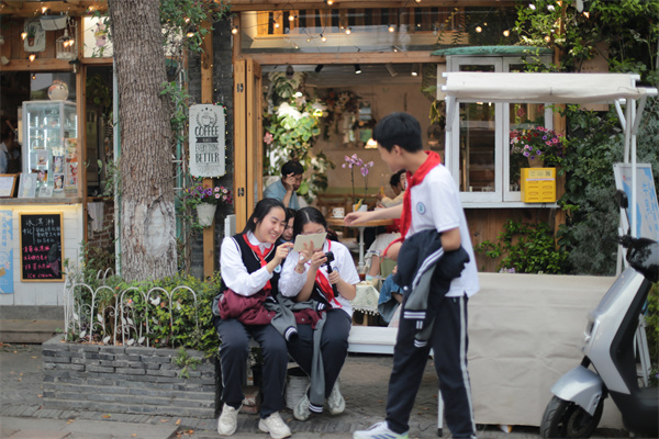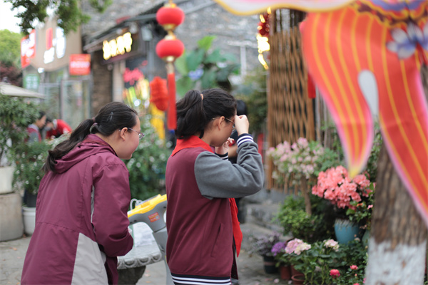 同學(xué)們一邊品味現(xiàn)代飲品,一邊觀察門(mén)外老揚(yáng)州人的生活節(jié)奏,體會(huì)古今交融的“慢時(shí)光”。在皮市街,老街的“新”與“舊”交相輝映,皮市街曾是明清時(shí)期的“皮貨一條街”,如今已成為年輕人心中的文藝圣地。同學(xué)們?cè)谶@里發(fā)現(xiàn)有很多創(chuàng)意景觀:薔薇花墻、方言文化墻、愛(ài)心紅綠燈、風(fēng)動(dòng)長(zhǎng)廊等網(wǎng)紅打卡點(diǎn),吸引了眾多游客。文旅活動(dòng)如“喚·醒”咖啡文化節(jié)、“嗨!皮元宵”市集等,讓街區(qū)充滿活力。老字號(hào)“大油火燒”與現(xiàn)代網(wǎng)紅店并存,讓同學(xué)們感受到揚(yáng)州人既堅(jiān)守傳統(tǒng)又擁抱變化的生活態(tài)度。