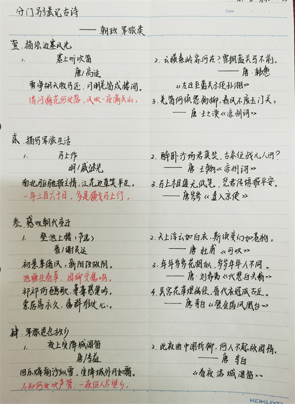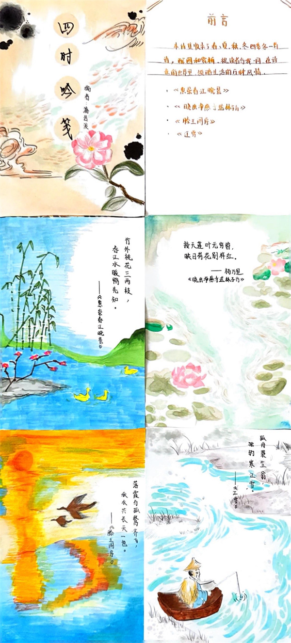 值得關注的是“分門別類輯古詩”小組的成果:同學們按思鄉(xiāng)、詠物、邊塞等主題整理經典詩作,撰寫賞析評點,精心編印成《古韻流光輯錄集》,成為校園里傳閱的“古詩學習手冊”。