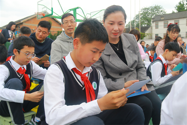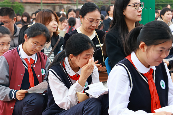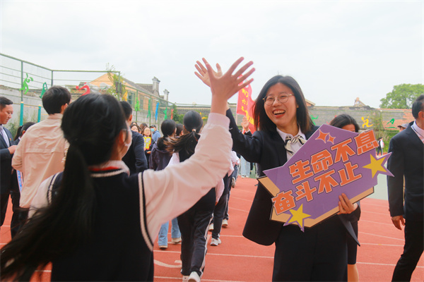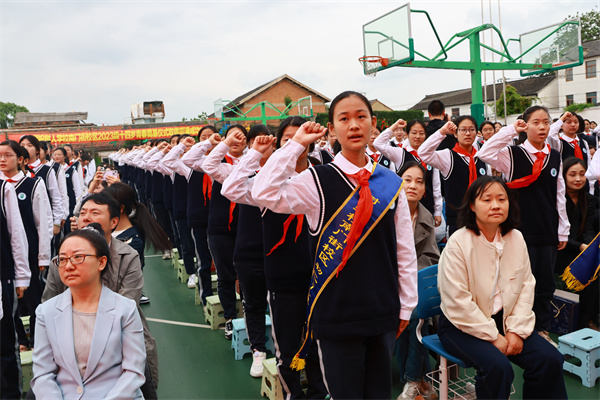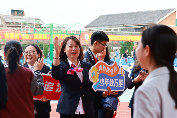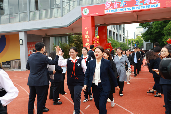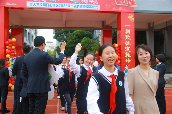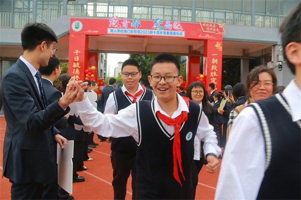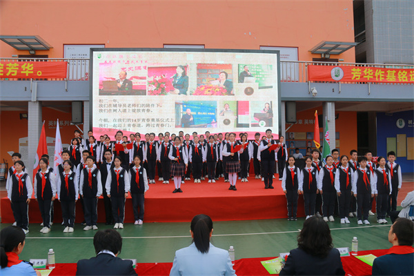 在年級主任湯衛(wèi)林的帶領(lǐng)下,同學(xué)們喊出青春的誓言,與未來的自己擊掌。十四歲的少年們奔向蓬勃的青年時光,當(dāng)模糊的童年影像與滾燙的青春誓言在此交匯,生命又以更加熱烈的形式綻放。