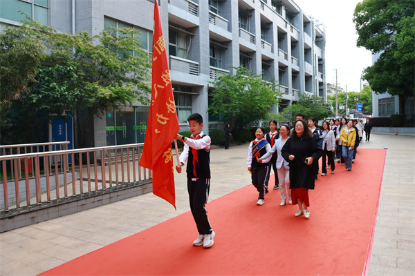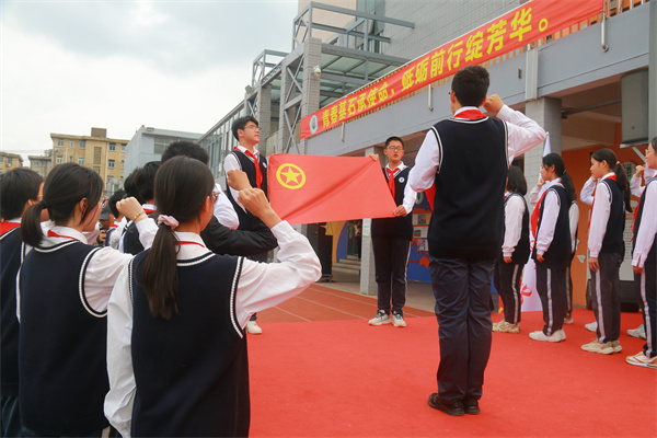 青春因信仰而閃耀,奮斗因傳承而永恒。在嘹亮的“出旗”聲中,少先隊員出隊旗、敬隊禮、唱隊歌,少先隊員代表為領(lǐng)導(dǎo)和嘉賓敬獻紅領(lǐng)巾。