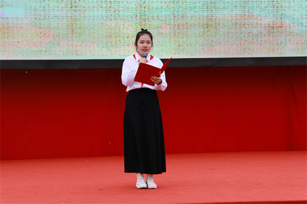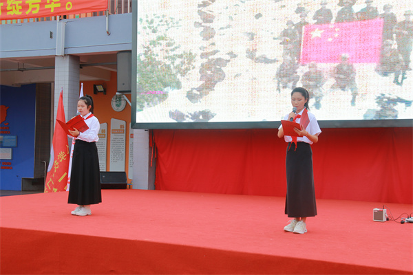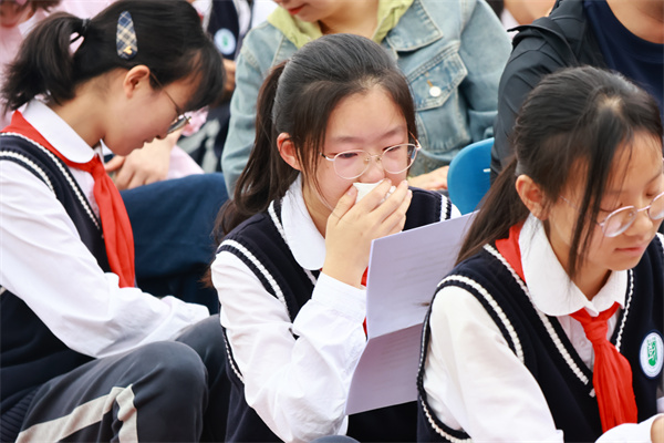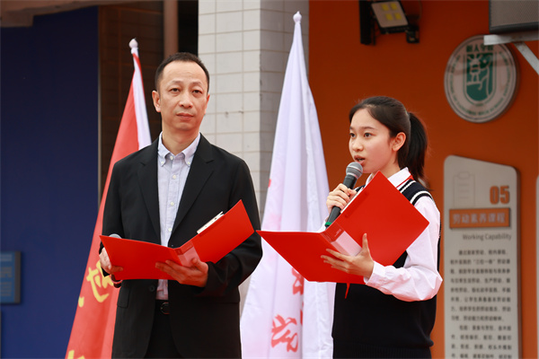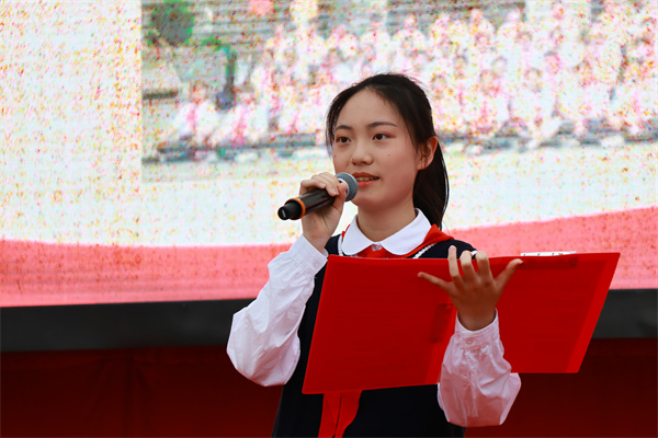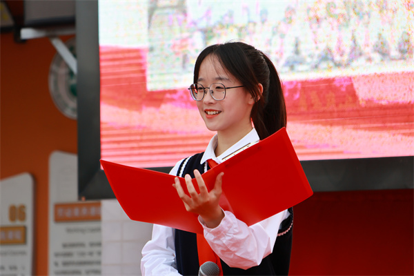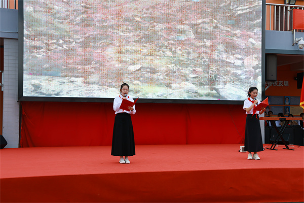 儀式在激昂的《滿江紅》朗誦中拉開帷幕,王星茗、席皓宸等同學(xué)以鏗鏘之聲點燃全場熱情,展現(xiàn)了樹人學(xué)子“少年負壯氣”的精神風(fēng)貌。隨后,全體師生肅立奏唱國歌,少先隊員行隊禮,鮮艷的五星紅旗象征著青春與家國情懷的緊密聯(lián)結(jié)。