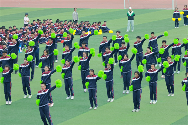 首先,14個班級分為七組,兩兩對決。各班同學(xué)身著統(tǒng)一校服,拿著色彩鮮艷的花球,精神抖擻地登場。他們動作整齊劃一,充滿力量與美感,每一次跳躍、每一個轉(zhuǎn)身都展現(xiàn)出青春的活力與自信。同學(xué)們在操場上盡情揮灑汗水,用整齊的動作和燦爛的笑容詮釋著對生活的熱愛,贏得了觀眾陣陣熱烈的掌聲。