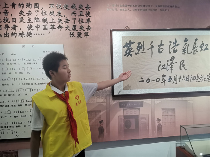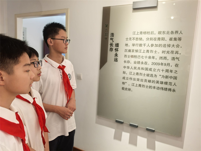 上午十時(shí)半,師生們整齊列隊(duì)步入陳列館。邁入古樸的院門(mén),一面木匾掛在館門(mén)上方,上面鐫刻著行楷“江上青烈士史料陳列館”,走上鋪著紅毯的臺(tái)階,就正式進(jìn)入館內(nèi)了。館內(nèi)莊嚴(yán)而肅穆的氛圍立即讓人肅然起敬。在講解員的帶領(lǐng)下,同學(xué)們從“探索真理年代,愛(ài)國(guó)民主家庭”“投身革命,矢志不渝”“教書(shū)育人,播撒火種”“千里救亡,喚起民眾”“開(kāi)辟革命根據(jù)地,血灑皖東北”“多才多藝,才華橫溢”“浩氣長(zhǎng)存,緬懷永遠(yuǎn)”這七方面全面了解關(guān)于江上青同志的生平事跡,感悟他的革命精神。
