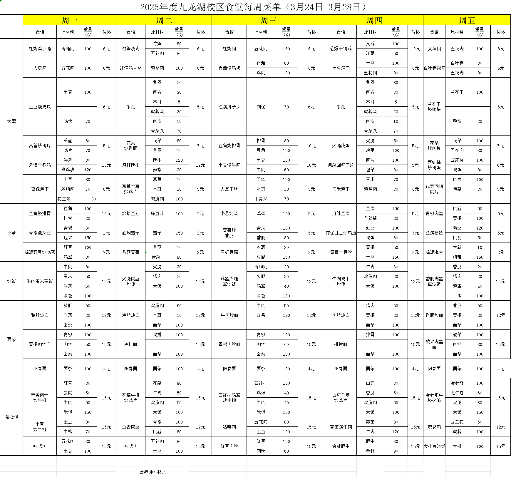 九龍湖校區(qū)2024——2025學(xué)年下學(xué)期第7周學(xué)生菜譜