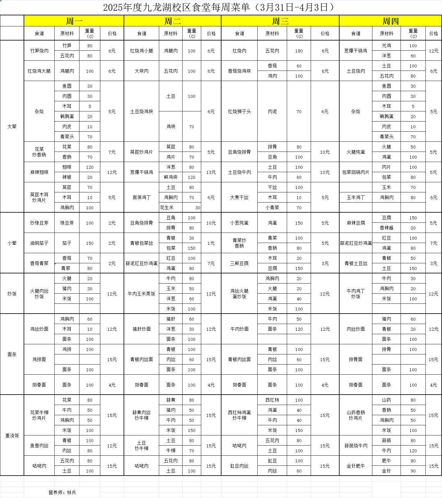 九龍湖校區(qū)2024——2025學(xué)年下學(xué)期第8周學(xué)生菜譜