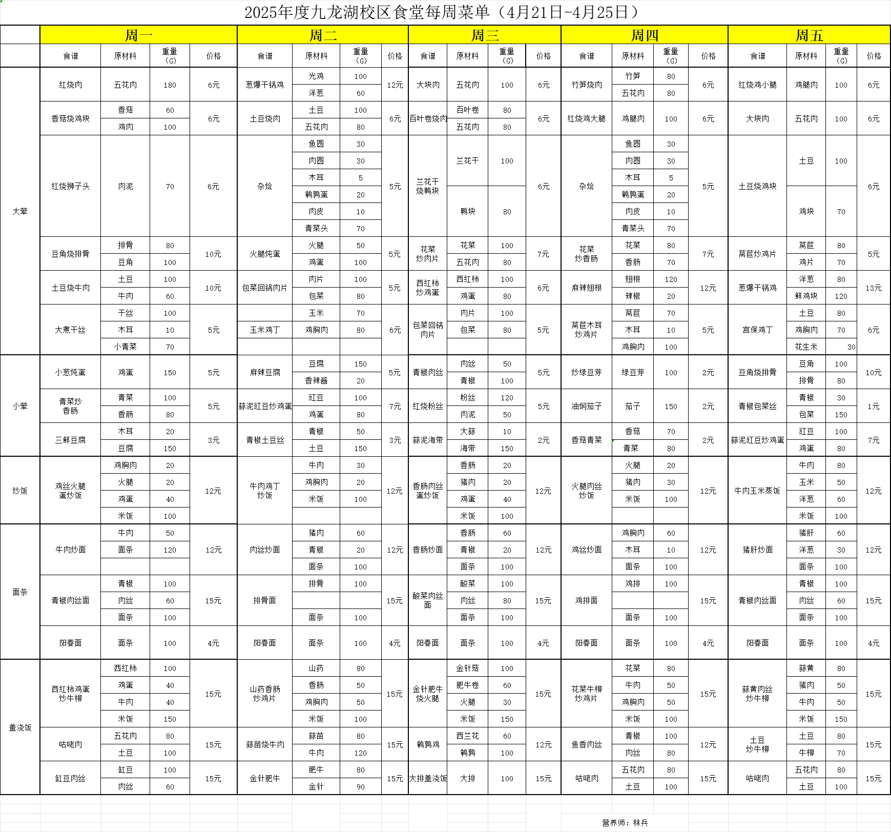 九龍湖校區(qū)2024——2025學(xué)年下學(xué)期第11周學(xué)生菜譜