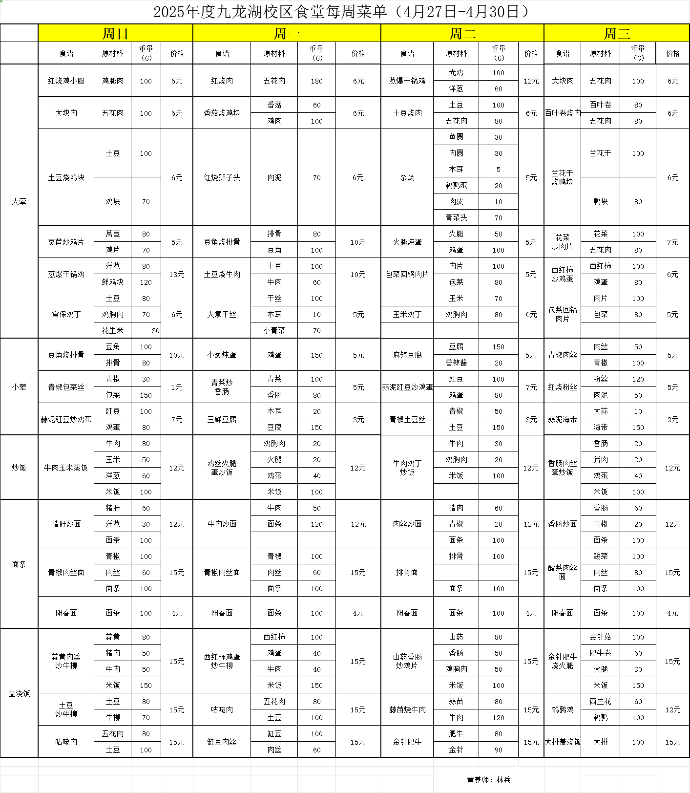 九龍湖校區(qū)2024——2025學年下學期第12周學生菜譜